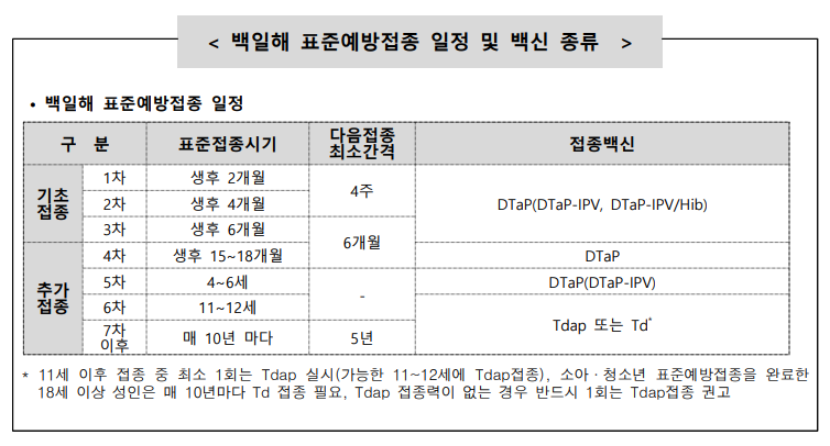 백일해 표준예방접종 일정은 아래의 표를 참고하세요.