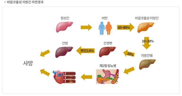 비알코올성 지방간은 대부분 경과가 양호하지만, 경우에 따라 비알코올성 지방간염이나 간경변증, 심지어 간암으로 진행되고 사망에 이를 수도 있습니다.